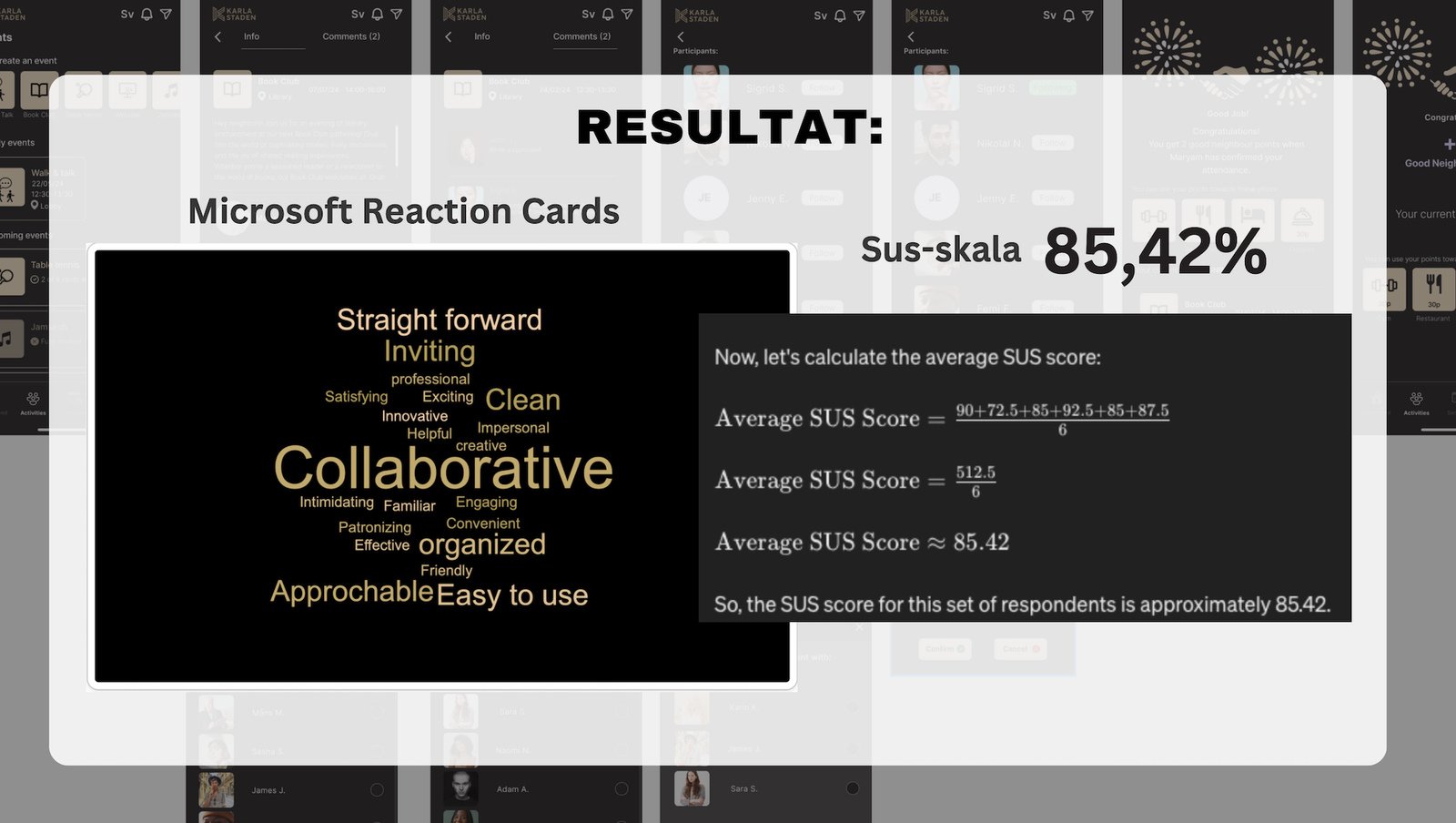 Vi testade lösningen i tre iterationer och utvärderade slutversionen med SUS-skala och Microsoft Reaction Cards.