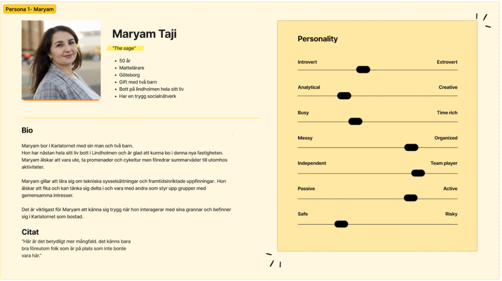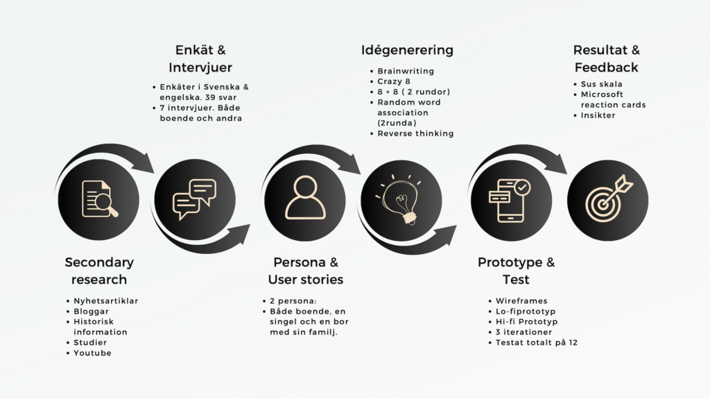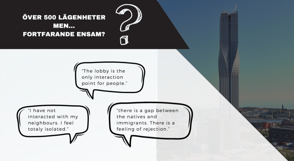 För att förstå hur UX-design kan bidra till ökad gemenskap i Karlatornet inledde vi med att utforska teman som ensamhet, gemenskap och psykisk hälsa. Vi kombinerade sekundärforskning, enkäter och djupintervjuer med boende för att få både bredd och djup i våra insikter.