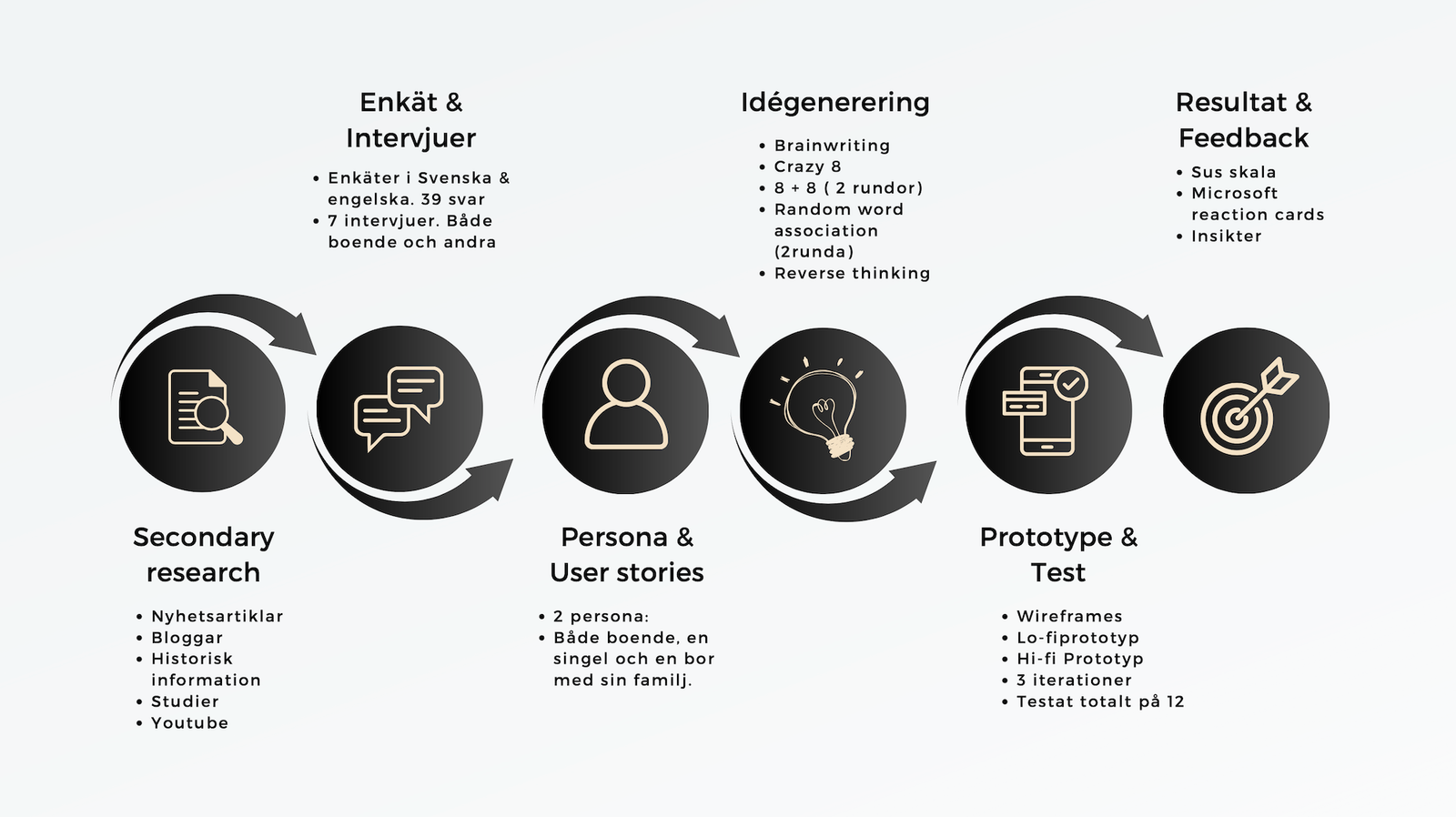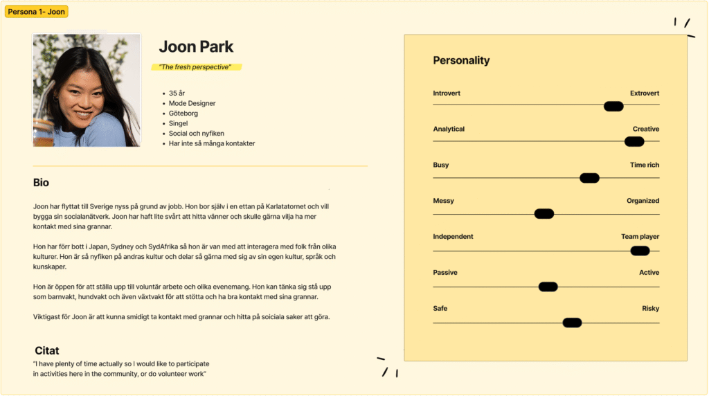 Vårt projekt var att skapa ett UX-koncept som stöttar de boende i att hitta varandra, känna tillhörighet och minska upplevelsen av ensamhet. Genom design ville vi bidra till en positiv vardag i en helt ny livsmiljö.