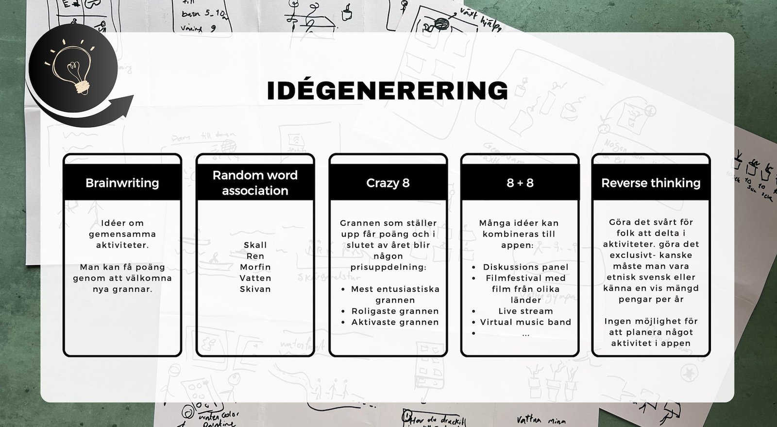 För att generera idéer och hitta innovativa lösningar använde vi oss av flera kreativa metoder, bland annat:
