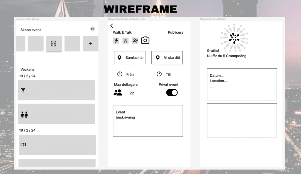 För att konkretisera konceptet skapade vi prototyper som visualiserar två nyckelscenarier kopplade till våra personas. Dessa scenarier visar hur olika typer av boende kan interagera med den sociala eventfunktionen i appen och hur den bidrar till att skapa meningsfulla möten.