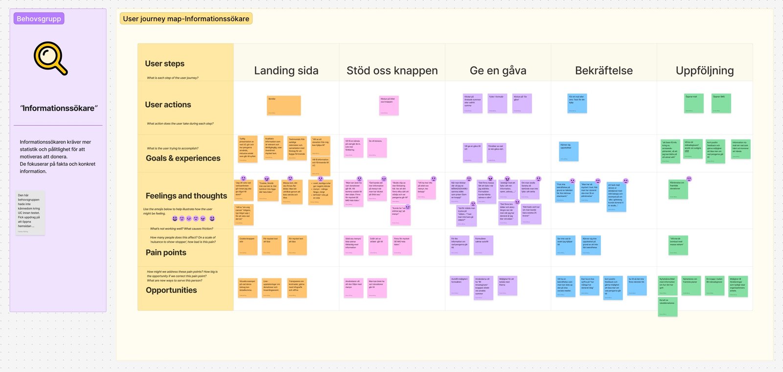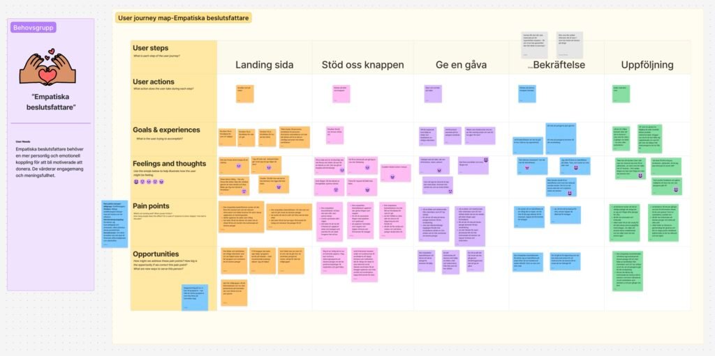 Jag planerade och faciliterade en kvalitativ workshop med personer som inte tidigare donerat till Ung Cancer. Workshopen inleddes med att deltagarna testade det befintliga donationsflödet och tillsammans kartlade givarresan i en customer journey map för att identifiera pain points och moment som riskerade att skapa avhopp.
