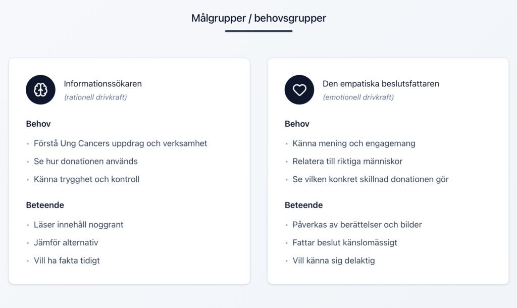 För att förstå var motivation tappades och friktion uppstod kartlade vi givarresan för båda behovsgrupperna genom fem centrala steg – från första intryck till uppföljning.